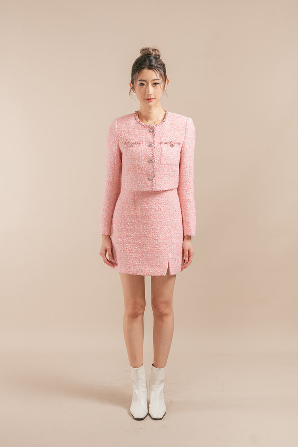 Indulge in luxury with our Serissa Tweed Cardigan and Dress Set. The 2 piece set is completed with diamond embellishments, a cropped cardigan with false buttoned pockets, and a sleeveless...